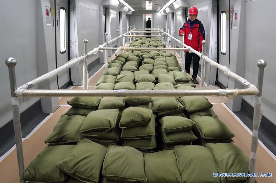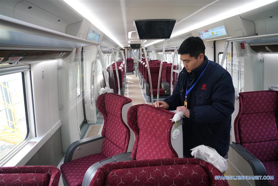 BEIJING, enero 30, 2019 (Xinhua) -- Imagen del 29 de enero de 2019 de un trabajador revisando los asientos de un tren para la nueva línea del aeropuerto en Beijing, capital de China. Beijing ha empezado a probar la línea de metro sin maquinista entre el centro de la ciudad y el nuevo aeropuerto internacional, anunció la empresa encargada, First Engineering, filial del China Railway Electrification Bureau Group. (Xinhua/Str)