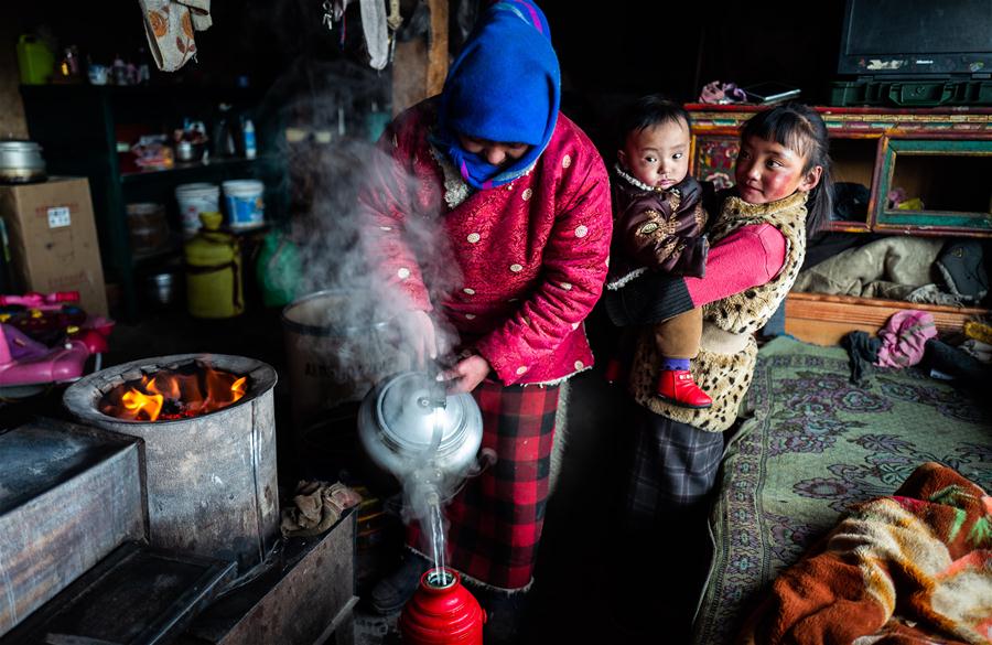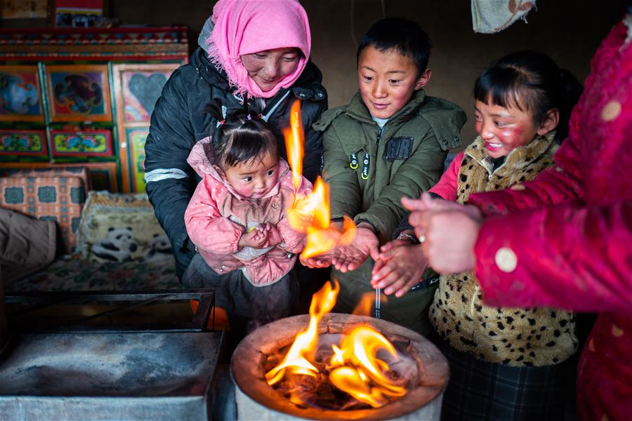 LHASA, enero 31, 2019 (Xinhua) -- Imagen del 17 de enero de 2019 de la pastora Qimei y su familia calentándose en un sitio de reasentamiento de pastores en el condado de Bange, en la Región Autónoma del Tíbet, en el suroeste de China. En el pasado, los pastores en el Tíbet soportaron un largo y frío invierno de octubre a finales de junio, antes de trasladarse a la pradera de verano. No tenían residencia fija y migraron cuando las estaciones cambiaron, llevando sus tiendas de campa?a, utensilios de cocina y otros artículos de primera necesidad a caballo. Hoy en día, la mayoría de los pastores se benefician del programa de reasentamiento. Ellos se despidieron de sus chozas de invierno y se mudaron a casas de estilo tibetano de ladrillo y mortero. (Xinhua/Purbu Zhaxi)