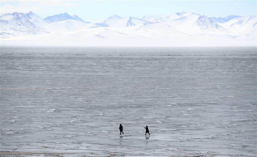 LHASA, enero 31, 2019 (Xinhua) -- Imagen del 17 de enero de 2019 de hijos de pastores jugando en un lago congelado, en la Región Autónoma del Tíbet, en el suroeste de China. En el pasado, los pastores en el Tíbet soportaron un largo y frío invierno de octubre a finales de junio, antes de trasladarse a la pradera de verano. No tenían residencia fija y migraron cuando las estaciones cambiaron, llevando sus tiendas de campa?a, utensilios de cocina y otros artículos de primera necesidad a caballo. Hoy en día, la mayoría de los pastores se benefician del programa de reasentamiento. Ellos se despidieron de sus chozas de invierno y se mudaron a casas de estilo tibetano de ladrillo y mortero. (Xinhua/Purbu Zhaxi)