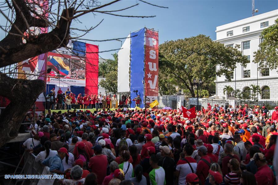 CARACAS, enero 31, 2019 (Xinhua) -- Trabajadores participan durante una movilización para respaldar la industria petrolera de Venezuela, frente al Palacio de Miraflores, en Caracas, Venezuela, el 31 de enero de 2019. El ministro venezolano para el Petróleo, Manuel Quevedo, aseguró el jueves que debido a las sanciones que Estados Unidos impuso a la refinería Citgo, filial de Petróleos de Venezuela (PDVSA) en el país norte?o, EEUU deberá pagar por adelantado el petróleo que compren. (Xinhua/Marcos Salgado)