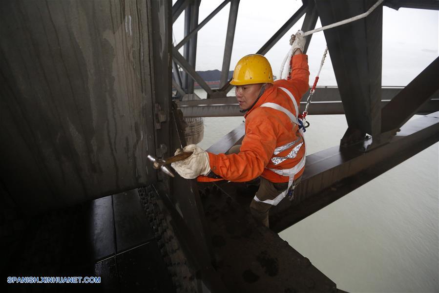 JIUJIANG, febrero 1, 2019 (Xinhua) -- Imagen del 31 de enero de 2019 de un empleado revisando el Puente del Río Yangtze de Jujiang, un puente entramado de carretera de doble piso y una sección importante de la Vía de Tren Beijing-Kowloon (Jingjiu), en Jiujiang, en la provincia de Jiangxi, en el este de China. Las inspecciones de seguridad se han reforzado para asegurar el transporte durante la temporada alta de viajes del Festival de Primavera 2019. (Xinhua/Ding Bo)