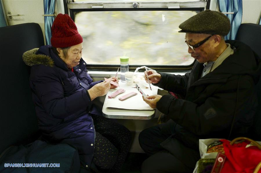 CHONGQING, febrero 1, 2019 (Xinhua) -- Imagen del 31 de enero de 2019 de dos pasajeros mayores conversando a bordo de un tren verde de baja velocidad que corre de la municipalidad de Chongqing, en el suroeste de China a la ciudad de Neijiang, de la provincia de Sichuan, en el suroeste de China. Los trenes verdes de baja velocidad todavía están en funcionamiento mientras los trenes bala corren por nuevas estaciones a través de China. Los antiguos trenes verdes son una alternativa de bajo costo para que las personas viajen durante la temporada alta de viajes del Festival de Primavera. (Xinhua/Liu Chan)
