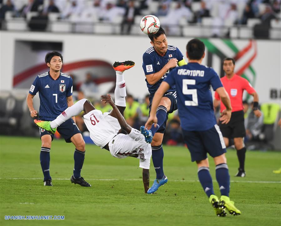 ABU DHABI, febrero 1, 2019 (Xinhua) -- El jugador Almoez Ali (2-i), de Qatar, realiza una anotación durante el partido de la final de la Copa Asiática 2019 de la Confederación Asiática de Fútbol (AFC, por sus siglas en inglés), ante Japón, en Abu Dhabi, Emiratos Arabes Unidos (EAU), el 1 de febrero de 2019. (Xinhua/Wu Huiwo)