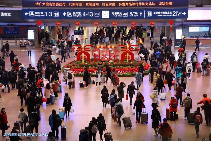 BEIJING, febrero 1, 2019 (Xinhua) -- Pasajeros caminan para abordar trenes en la Estación de Trenes del Oeste de Beijing, en Beijing, capital de China, el 1 de febrero de 2019. La empresa China Railway Beijing Group Co., Ltd. esperaba transportar 1.03 millones de pasajeros el viernes. El ferrocarril de Beijing fue testigo de un aumento en los viajes, cuando la gente comenzó a emprender viajes para el A?o Nuevo Lunar, que se celebra el 5 de febrero de 2019. (Xinhua/Xing Guangli)