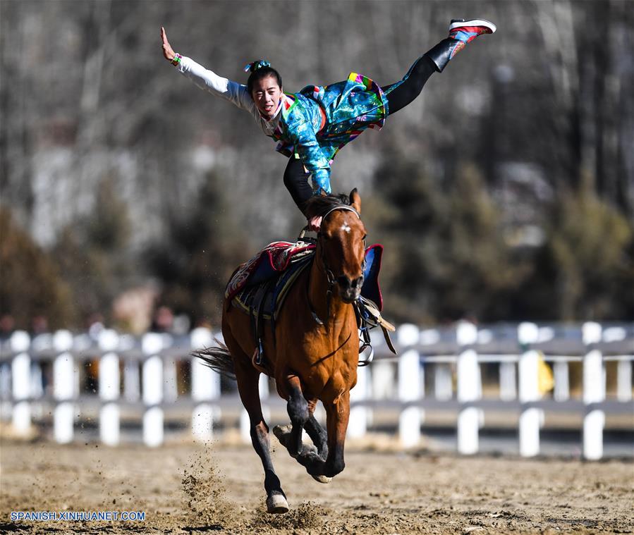 LHASA, febrero 7, 2019 (Xinhua) -- Una mujer demuestra sus habilidades ecuestres durante un evento llevado a cabo para celebrar el A?o Nuevo tibetano, en Lhasa, capital de la Región Autónoma del Tíbet, en el suroeste de China, el 7 de febrero de 2019. (Xinhua/Purbu Zhaxi)