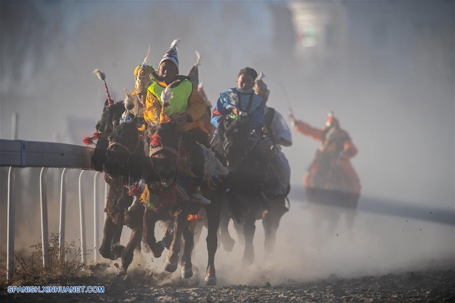 LHASA, febrero 7, 2019 (Xinhua) -- Corredores compiten durante una carrera de caballos llevada a cabo para celebrar el A?o Nuevo tibetano, en Lhasa, capital de la Región Autónoma del Tíbet, en el suroeste de China, el 7 de febrero de 2019. (Xinhua/Purbu Zhaxi)