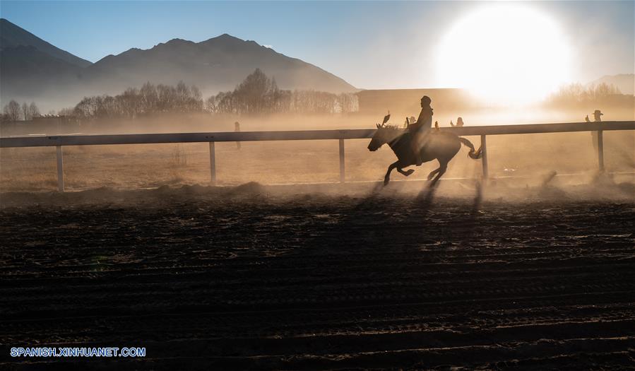 LHASA, febrero 7, 2019 (Xinhua) -- Un corredor compite durante una carrera de caballos llevada a cabo para celebrar el A?o Nuevo tibetano, en Lhasa, capital de la Región Autónoma del Tíbet, en el suroeste de China, el 7 de febrero de 2019. (Xinhua/Purbu Zhaxi)