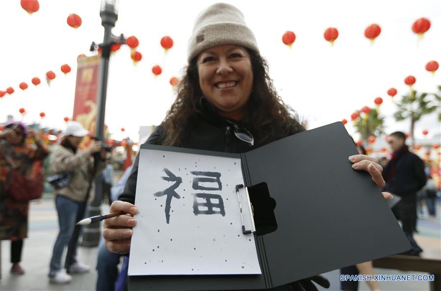 LOS ANGELES, febrero 10, 2019 (Xinhua) -- Imagen del 9 de febrero de 2019, de una mujer mostrando el carácter chino "fu", que significa fortuna, durante las actividades en celebración del A?o Nuevo Lunar chino, en Universal Studios Hollywood, en Los Angeles, Estados Unidos. (Xinhua/Li Ying)