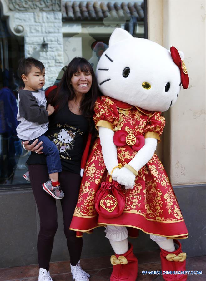 LOS ANGELES, febrero 10, 2019 (Xinhua) -- Imagen del 9 de febrero de 2019, de turistas posando con una persona disfrazada como Helo Kitty portando un vestido tradicional chino durante las actividades en celebración del A?o Nuevo Lunar chino, en Universal Studios Hollywood, en Los Angeles, Estados Unidos. (Xinhua/Li Ying)