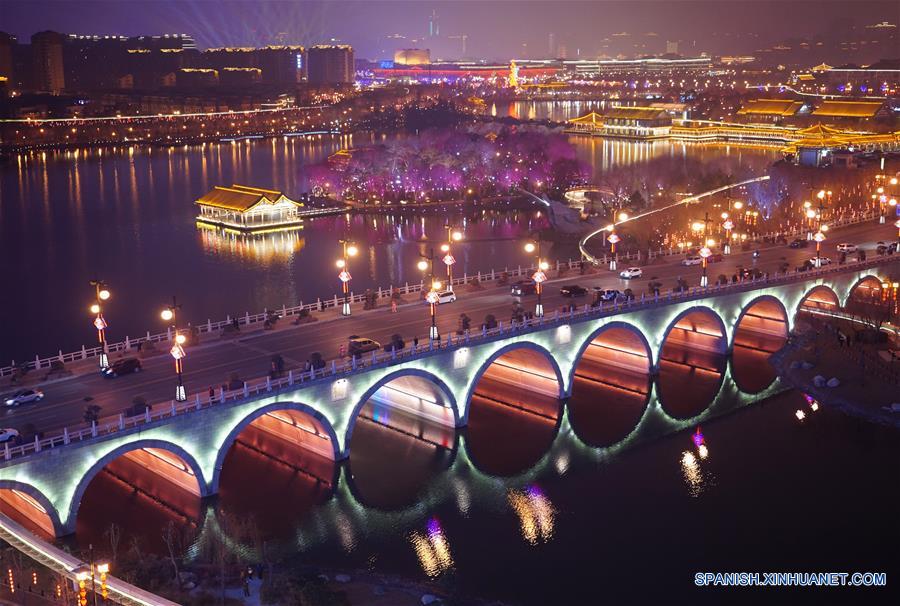 SHAANXI, febrero 10, 2019 (Xinhua) -- Imagen del 9 de febrero de 2019, del paisaje nocturno del Parque Qujiangchi en Xi'an, capital de la provincia de Shaanxi, en el noroeste de China. La ciudad se encuentra decorada con coloridas linternas durante la noche por el Festival de Primavera. (Xinhua/Shao Rui)