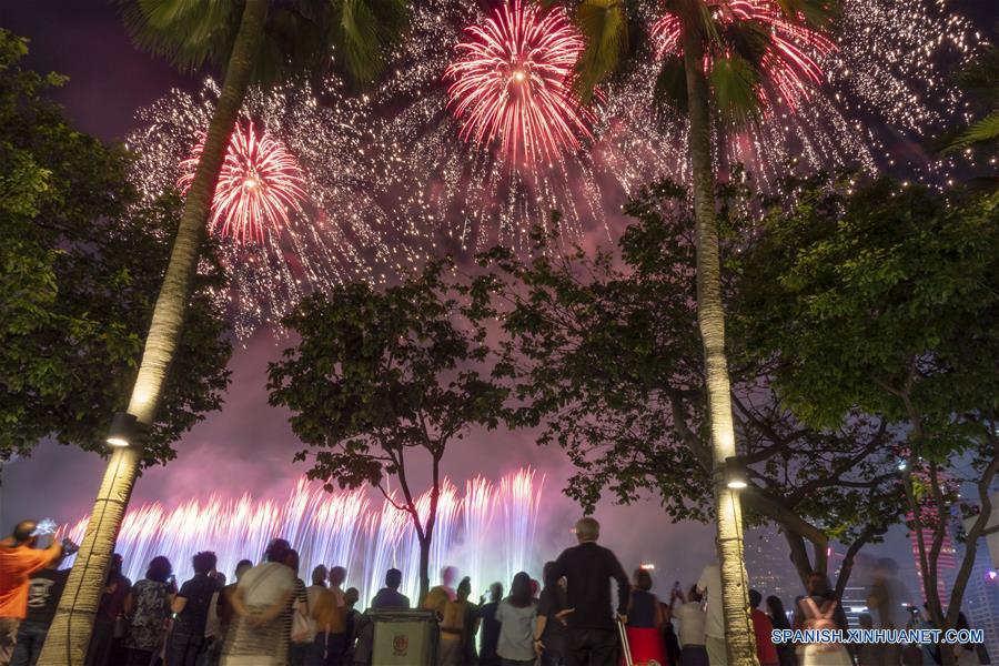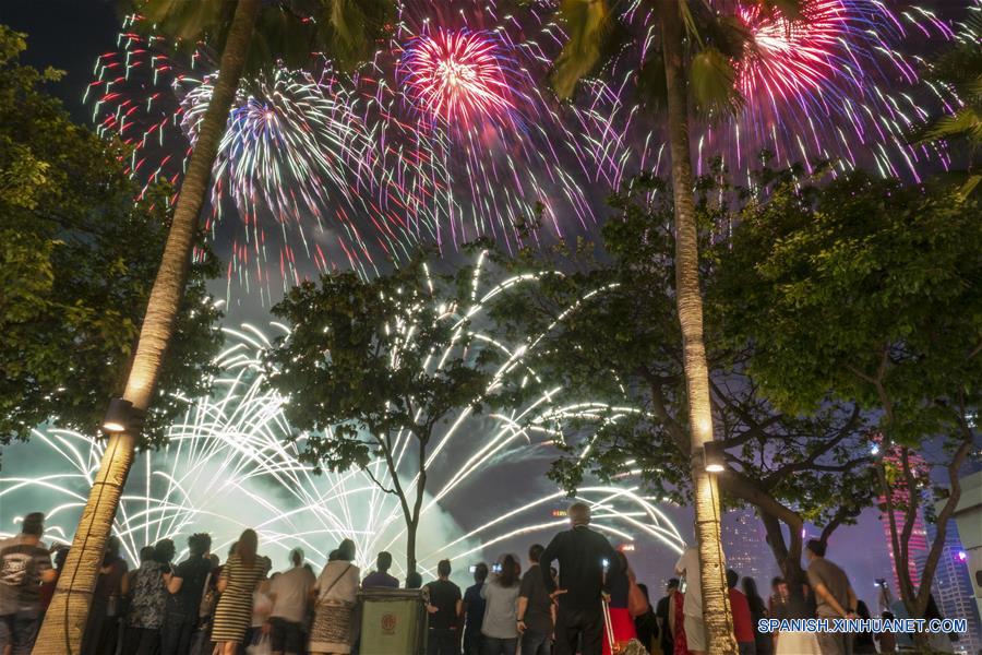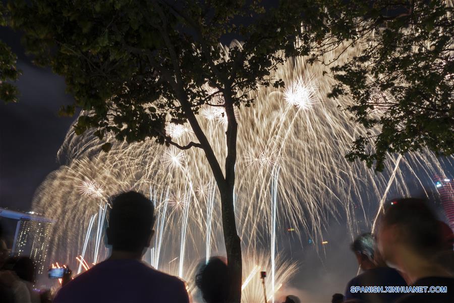 SINGAPUR, febrero 10, 2019 (Xinhua) -- Personas observan el último espectáculo de fuegos artificiales llevado a cabo por un equipo chino por la celebración del A?o Nuevo Lunar denominada "Río Hongbao", en Marina Bay, en Singapur, capital de Singapur, el 10 de febrero de 2019. (Xinhua/Then Chih Wey)