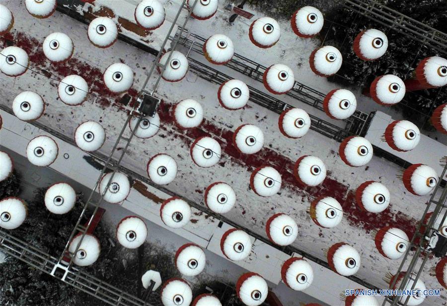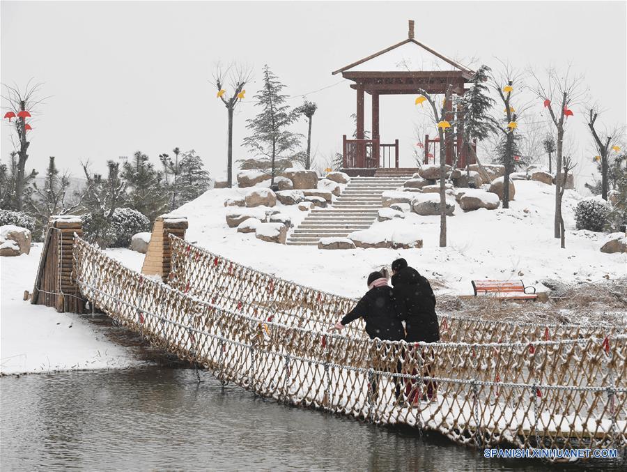 SHANXI, febrero 10, 2019 (Xinhua) -- Personas se divierten en la nieve en el Parque Minyue en el condado de Jishan en Yuncheng, en la provincia de Shanxi, en el norte de China, el 10 de febrero de 2019. Una nevada afectó muchas regiones en la parte sur de la provincia desde el sábado. (Xinhua/Li Lujian)