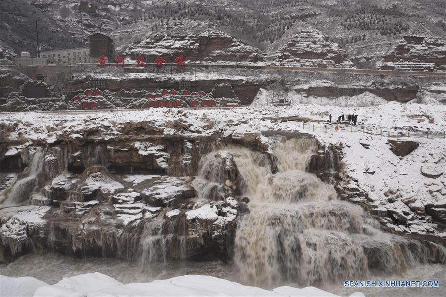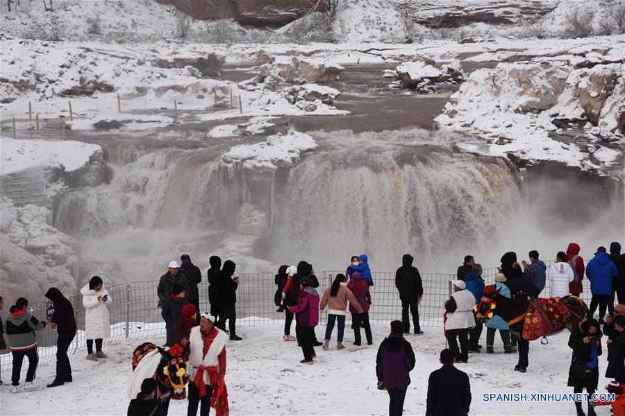 SHANXI, febrero 10, 2019 (Xinhua) -- Turistas visitan la Cascada Hukou en el Río Amarillo en el condado de Jixian, en la provincia de Shanxi, en el norte de China, el 10 de febrero de 2019. Una nevada afectó muchas regiones en la parte sur de la provincia desde el sábado. (Xinhua/Lyu Guiming)