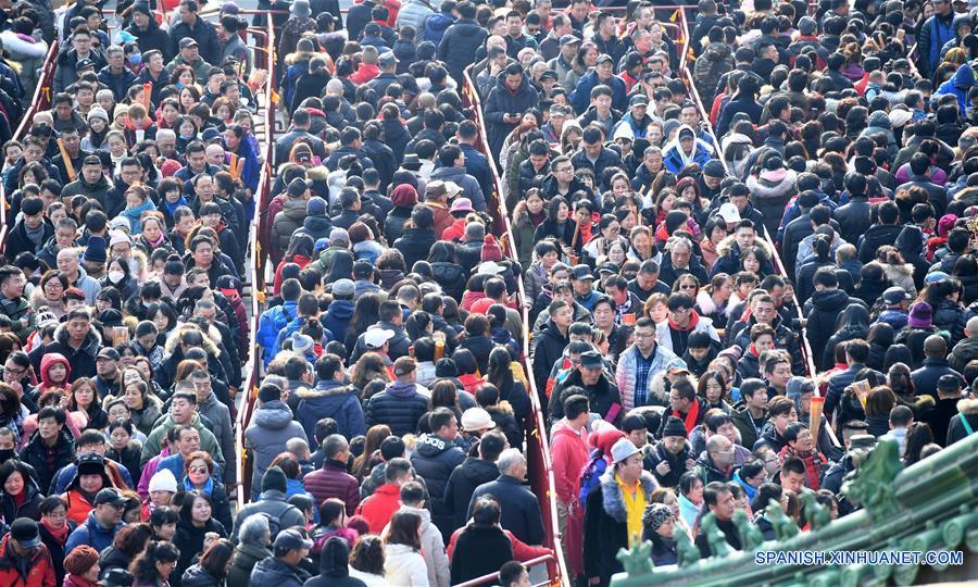 Imagen del 5 de febrero de 2019 de personas formándose para orar por bendiciones en el Parque Badachu en Beijing, capital de China. Los ingresos turísticos nacionales de China se incrementaron 513,900 millones de yuanes (cerca de 76,210 millones de dólares estadounidenses) durante las vacaciones de la semana de la Fiesta de la Primavera que concluye este domingo, un incremento anual de 8.2 por ciento, dijo el Ministerio de Cultura y Turismo. Durante las vacaciones se hicieron 415 millones de viajes en todo el país, un aumento de 7.6 por ciento interanual, indicó el ministerio Crece turismo en Beijing durante Fiesta de Primavera. (Xinhua/Li Jundong)