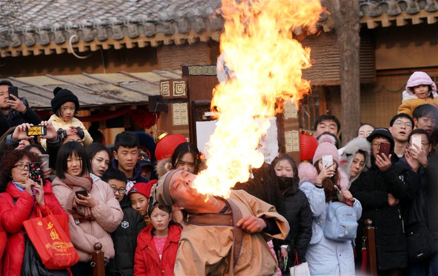 HENAN, febrero 11, 2019 (Xinhua) -- Imagen del 7 de febrero de 2019 de turistas visitando Xiaosongcheng, una atracción turística en Kaifeng, en la provincia de Henan, en el centro de China. Más de 32 millones de turistas visitaron la provincia de Henan, durante las vacaciones por la Fiesta de Primavera, de una semana de duración, generando más de 18 billones de yuanes (aproximadamente 2.7 millones de dólares estadounidenses) de ingreso, de acuerdo con las autoridades locales. (Xinhua/Li An)