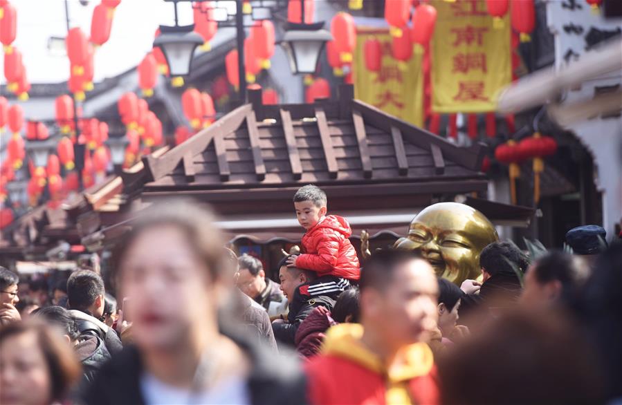 ZHEJIANG, febrero 11, 2019 (Xinhua) -- Imagen del 6 de febrero de 2019 de un ni?o siendo cargado en hombros en la calle Hefang, en Hangzhou, capital de la provincia de Zhejiang, en el este de China. El ingreso del turismo local de China fue de 513.9 billones de yuanes (aproximadamente 76.21 billones de dólares estadounidenses) durante las vacaciones por la Fiesta de Primavera, que terminó el domingo, un incremento anual de 8.2 por ciento, de acuerdo con el Ministerio de Cultura y Turismo. (Xinhua/Long Wei)