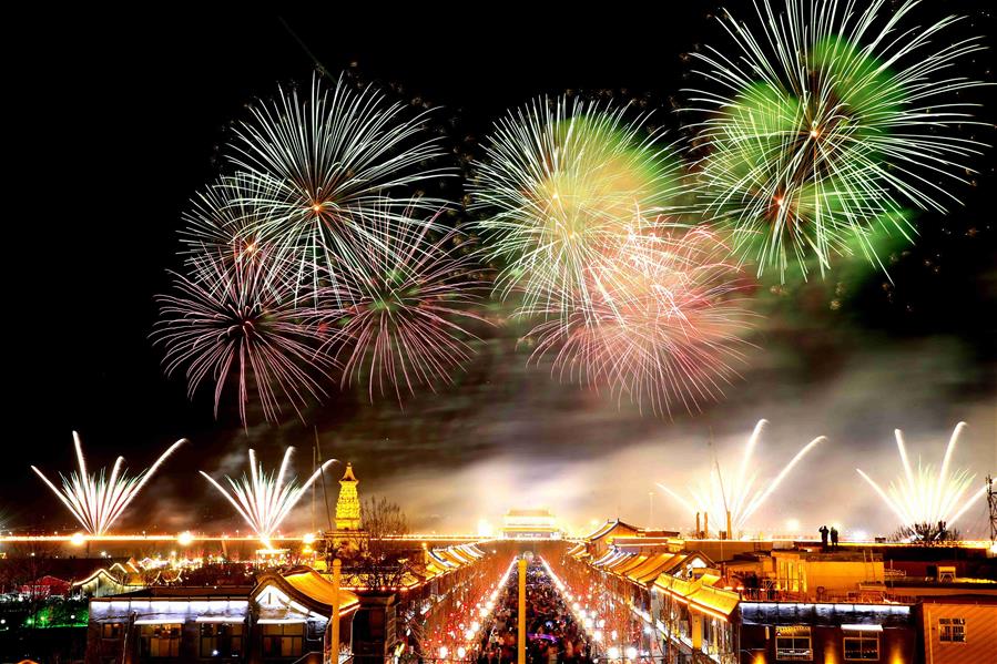 HEBEI, febrero 11, 2019 (Xinhua) -- Imagen del 9 de febrero de 2019 de una muestra de fuegos artificiales virtuales sobre la antigua ciudad de Zhengding, en la provincia de Hebei, en el norte de China. El ingreso del turismo local de China fue de 513.9 billones de yuanes (aproximadamente 76.21 billones de dólares estadounidenses) durante las vacaciones por la Fiesta de Primavera, que terminó el domingo, un incremento anual de 8.2 por ciento, de acuerdo con el Ministerio de Cultura y Turismo. (Xinhua/Zhang Haiqiang)