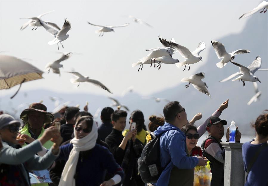 YUNNAN, febrero 11, 2019 (Xinhua) -- Imagen del 10 de febrero de 2019 de turistas observando gaviotas de cabeza negra en el Lago Dianchi, en Kunming, capital de la provincia de Yunnan, en el suroeste de China. El ingreso del turismo local de China fue de 513.9 billones de yuanes (aproximadamente 76.21 billones de dólares estadounidenses) durante las vacaciones por la Fiesta de Primavera, que terminó el domingo, un incremento anual de 8.2 por ciento, de acuerdo con el Ministerio de Cultura y Turismo. (Xinhua/Liang Zhiqiang)