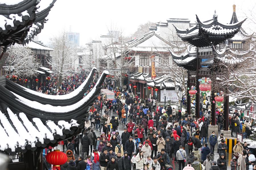 JIANGSU, febrero 11, 2019 (Xinhua) -- Imagen del 8 de febrero de 2019 de turistas visitando el punto escénico del Templo de Confucio en Nanjing, en la provincia de Jiangsu, en el este de China. El ingreso del turismo local de China fue de 513.9 billones de yuanes (aproximadamente 76.21 billones de dólares estadounidenses) durante las vacaciones por la Fiesta de Primavera, que terminó el domingo, un incremento anual de 8.2 por ciento, de acuerdo con el Ministerio de Cultura y Turismo. (Xinhua/Wang Xin)