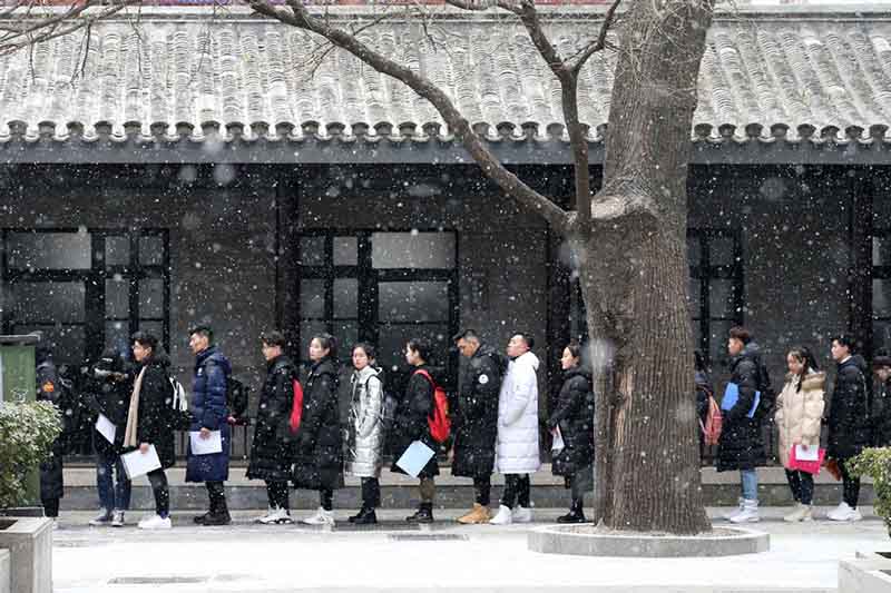Los estudiantes hacen fila para someterse a un examen de admisión en la Academia Central de Drama en Beijing el 12 de febrero de 2019, día en el que cayó la primera gran nevada del a?o. [Foto por Wang Zhuangfei / chinadaily.com.cn]