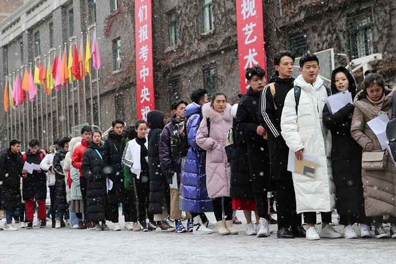 Los estudiantes hacen fila para someterse a un examen de admisión en la Academia Central de Drama en Beijing el 12 de febrero de 2019, día en el que cayó la primera gran nevada del a?o. [Foto por Wang Zhuangfei / chinadaily.com.cn]