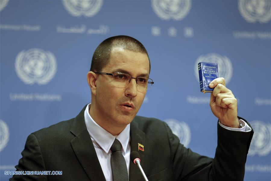 NUEVA YORK, febrero 12, 2019 (Xinhua) -- El ministro de Relaciones Exteriores de Venezuela, Jorge Arreaza, participa durante una conferencia de prensa en la sede de la Organización de las Naciones Unidas (ONU), en Nueva York, Estados Unidos, el 12 de febrero de 2019. El ministro de Relaciones Exteriores de Venezuela, Jorge Arreaza, dijo el martes que el gobierno encabezado por el presidente Nicolás Maduro está listo para sentarse con la oposición sin condiciones y buscar una solución a la crisis política. (Xinhua/Li Muzi)