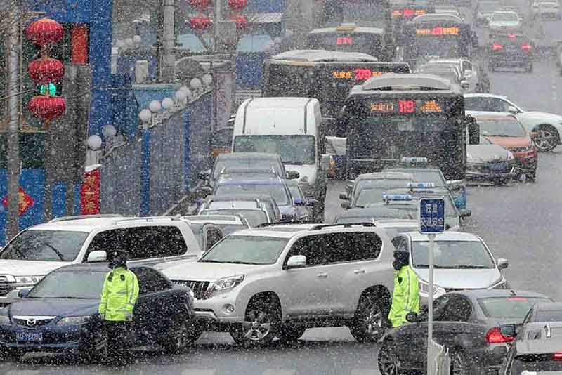 La policía dirige el tráfico durante la nevada en Beijing el 12 de febrero de 2019. [Foto de Feng Yongbin para chinadaily.com.cn]