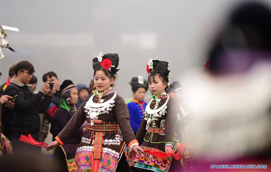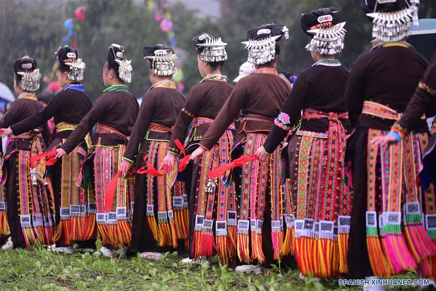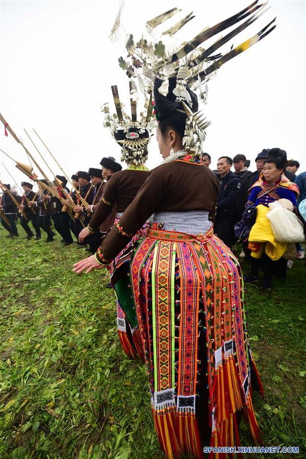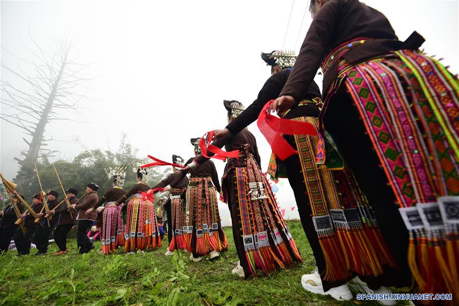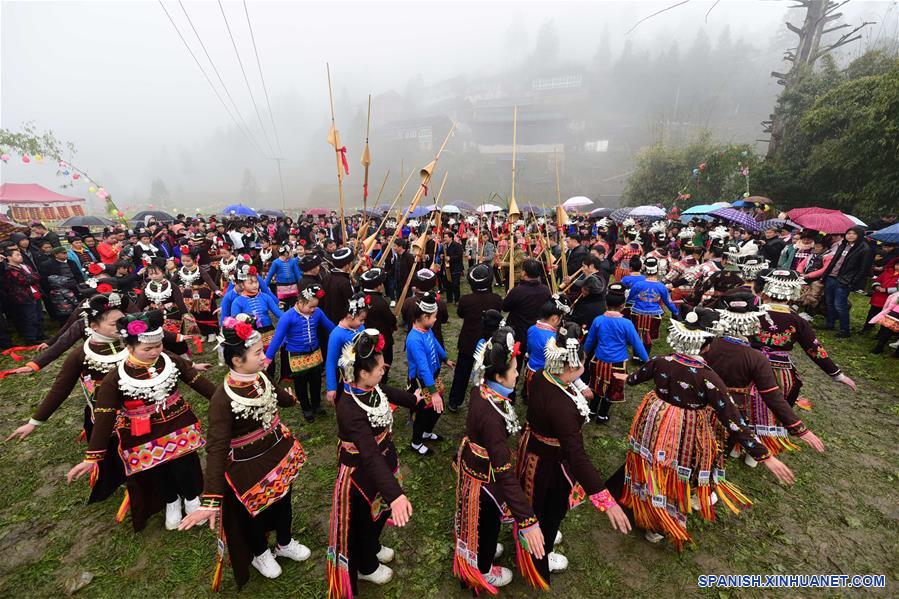 GUIZHOU, febrero 12, 2019 (Xinhua) -- Residentes interpretan una danza folclórica, en la villa de Paijie del condado de Danzhai, provincia de Guizhou, en el suroeste de China, el 12 de febrero de 2019. Las personas del grupo étnico Miao de Paijie y villas vecinas asistieron el martes a un evento para celebrar el A?o Nuevo Lunar chino. (Xinhua/Yang Wukui)