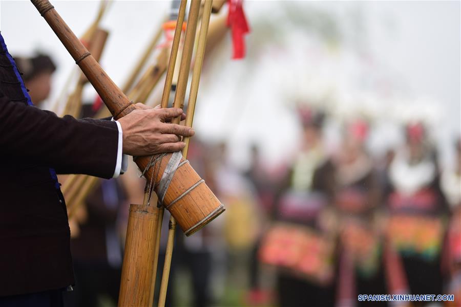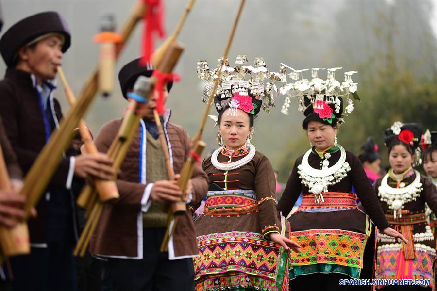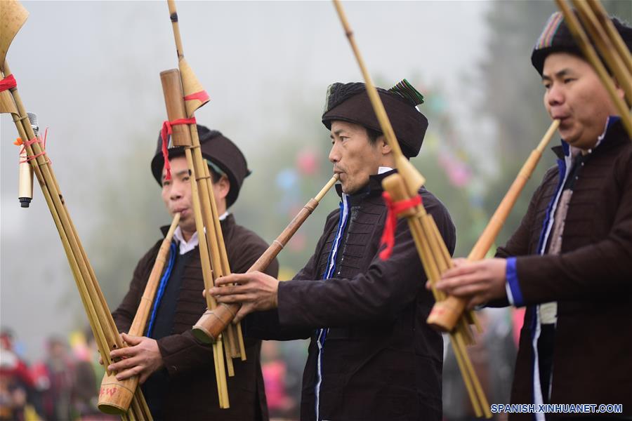 GUIZHOU, febrero 12, 2019 (Xinhua) -- Residentes tocan el lusheng, un instrumento de viento de tubo de ca?a, en la villa de Paijie del condado de Danzhai, provincia de Guizhou, en el suroeste de China, el 12 de febrero de 2019. Las personas del grupo étnico Miao de Paijie y villas vecinas asistieron el martes a un evento para celebrar el A?o Nuevo Lunar chino. (Xinhua/Yang Wukui)