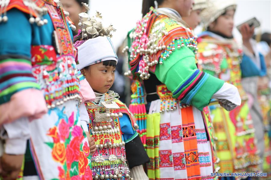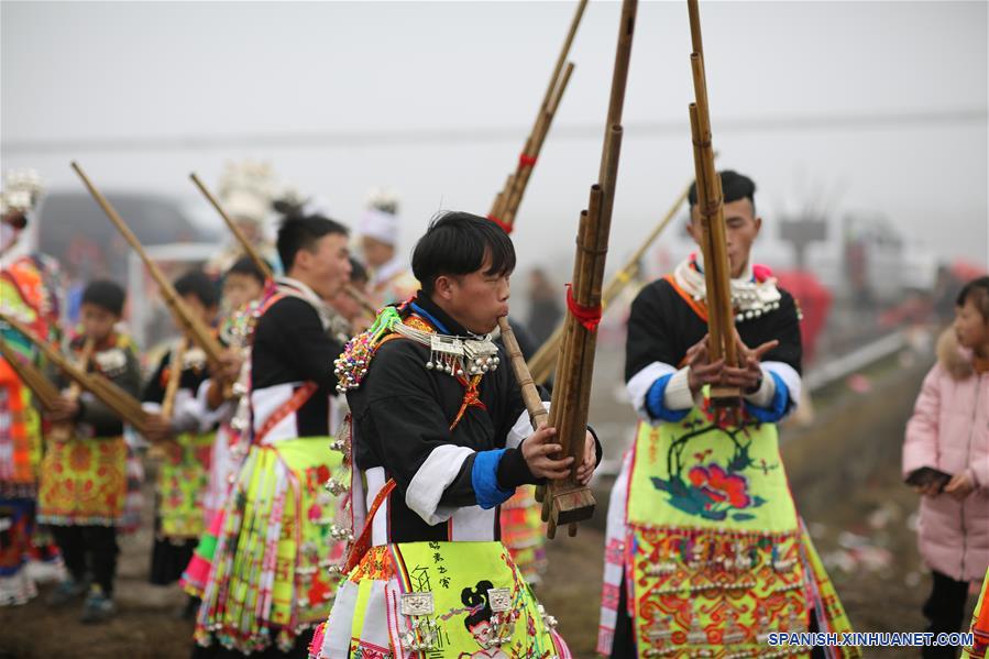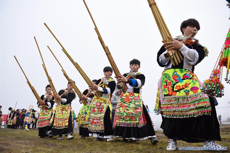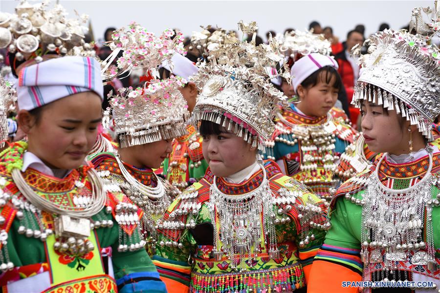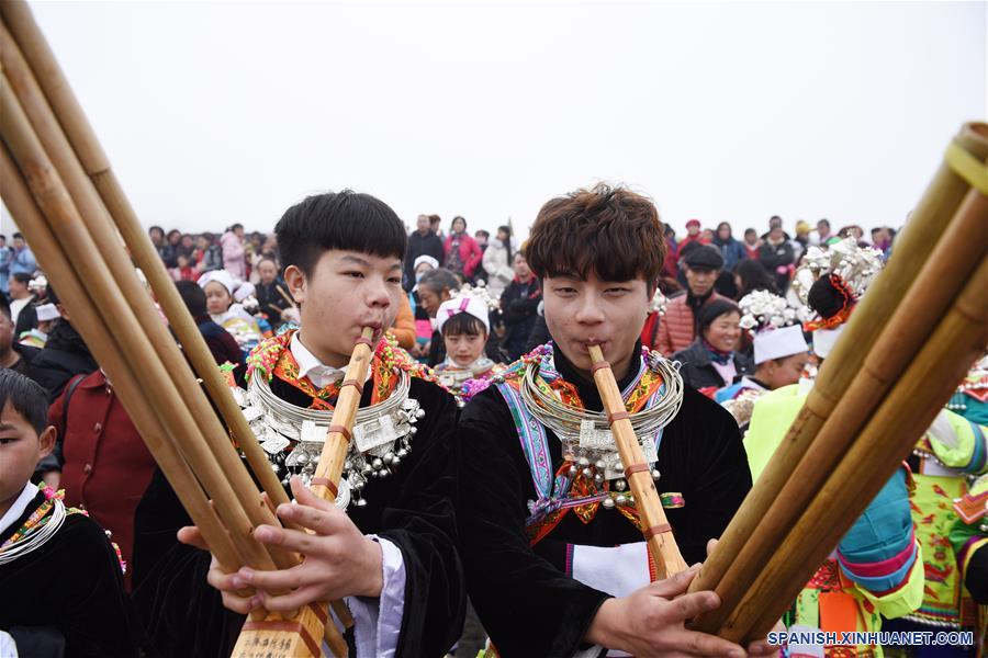 GUIZHOU, febrero 12, 2019 (Xinhua) -- Personas del grupo étnico Miao portando trajes tradicionales participan en una actividad llamada "Tiaoyue" o "danza bajo la luz de la luna", en la villa de Zhongpai del condado de Longli en la Prefectura Autónoma Bouyei y Miao de Qiannan, provincia de Guizhou, en el suroeste de China, el 12 de febrero de 2019. "Tiaoyue" es una costumbre practicada tradicionalmente por jóvenes Miao para expresar amor y encontrar una posible pareja. (Xinhua/Zhang Hui)