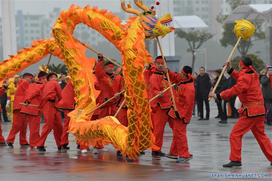 JIANGXI, febrero 12, 2019 (Xinhua) -- Ejecutantes interpretan la danza del dragón en el octavo día de A?o Nuevo Lunar chino, en el condado de Nanchang de la ciudad de Nanchang, provincia de Jiangxi, en el este de China, el 12 de febrero de 2019. Los equipos de las danzas del león y el dragón de las localidades ofrecen actuaciones para celebrar el a?o nuevo chino. (Xinhua/Peng Zhaozhi)