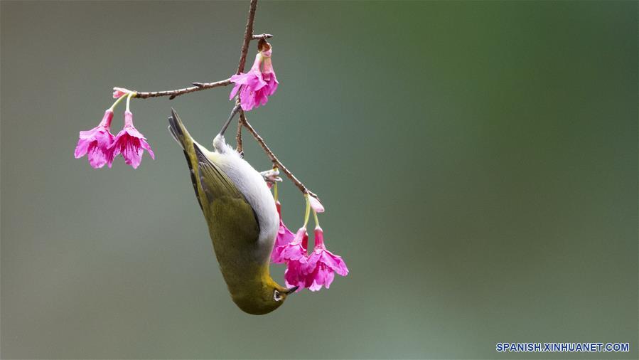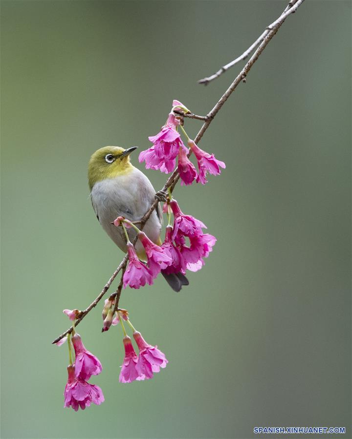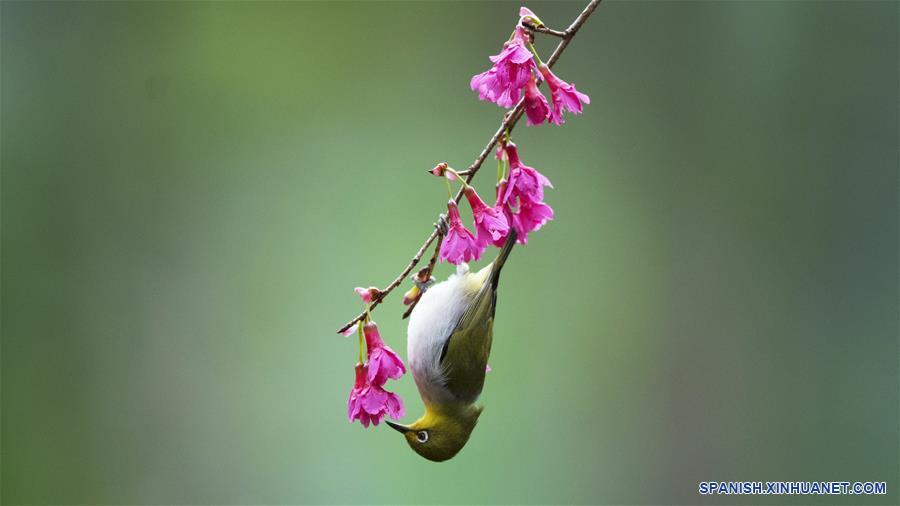 FUJIAN, febrero 13, 2019 (Xinhua) -- Imagen del 12 de febrero de 2019 de un ojiblanco posándose en las flores de cerezo, en Fuzhou, provincia de Fujian, en el sureste de China. (Xinhua/Mei Yongcun)