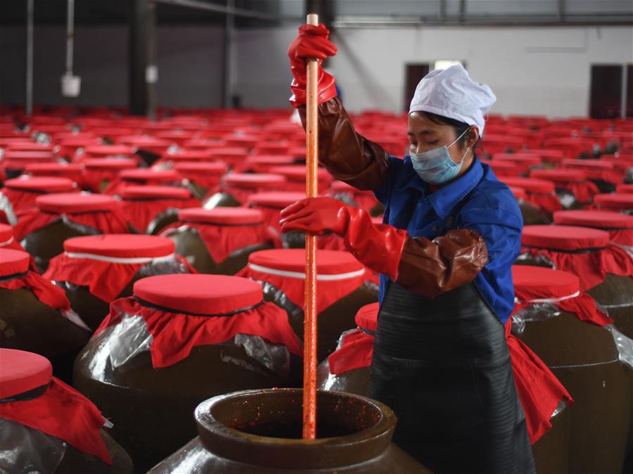 GUIZHOU, febrero 13, 2019 (Xinhua) -- Una trabajadora revisa la sopa agria roja en fermentación en una planta de procesamiento de alimentos, en el condado de Majiang, provincia de Guizhou, en el suroeste de China, el 13 de febrero de 2019. La sopa agria roja, una sopa tradicional en la Prefectura Autónoma Miao y Dong de Qiandongnan, es hecha a base de chiles frescos, tomates y jengibre. (Xinhua/Cai Xingwen)