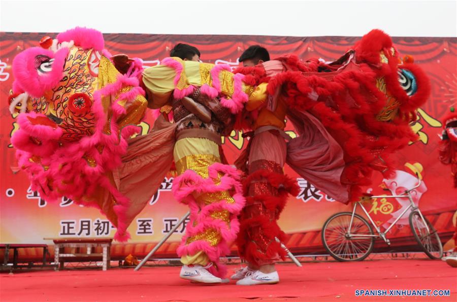 HEBEI, febrero 13, 2019 (Xinhua) -- Artistas interpretan la danza del león durante una feria de templo, en Handan, provincia de Hebei, en el norte de China, el 13 de febrero de 2019. (Xinhua/Yang Yang)