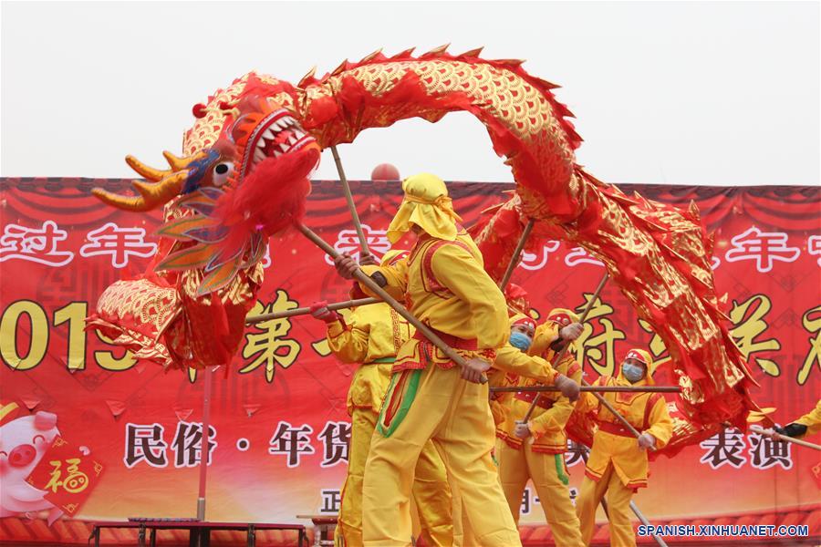 HEBEI, febrero 13, 2019 (Xinhua) -- Artistas interpretan la danza del dragón durante una feria de templo, en Handan, provincia de Hebei, en el norte de China, el 13 de febrero de 2019. (Xinhua/Yang Yang)
