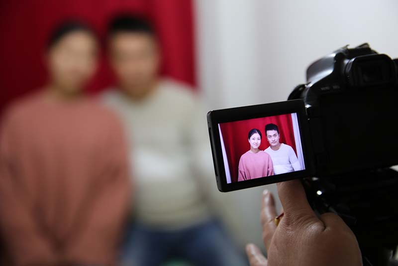 Una pareja joven se hace una foto en una oficina de registro de matrimonios en la ciudad de Neijiang, provincia de Sichuan, el 14 de febrero de 2019. [Foto por Lan Zitao / Asianewsphoto]