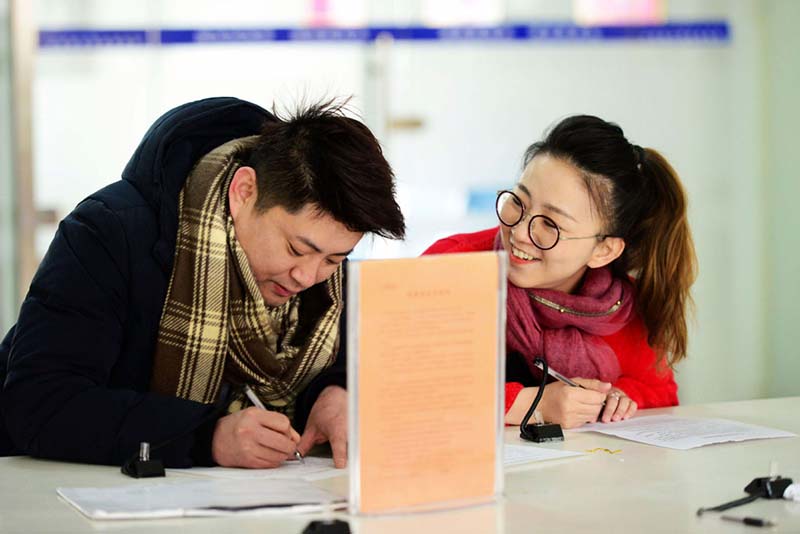 Una pareja joven en una oficina de registro de matrimonios en la ciudad de Qingdao, provincia de Shandong, el 14 de febrero de 2019. [Foto por Yu Fangping / Asianewsphoto]