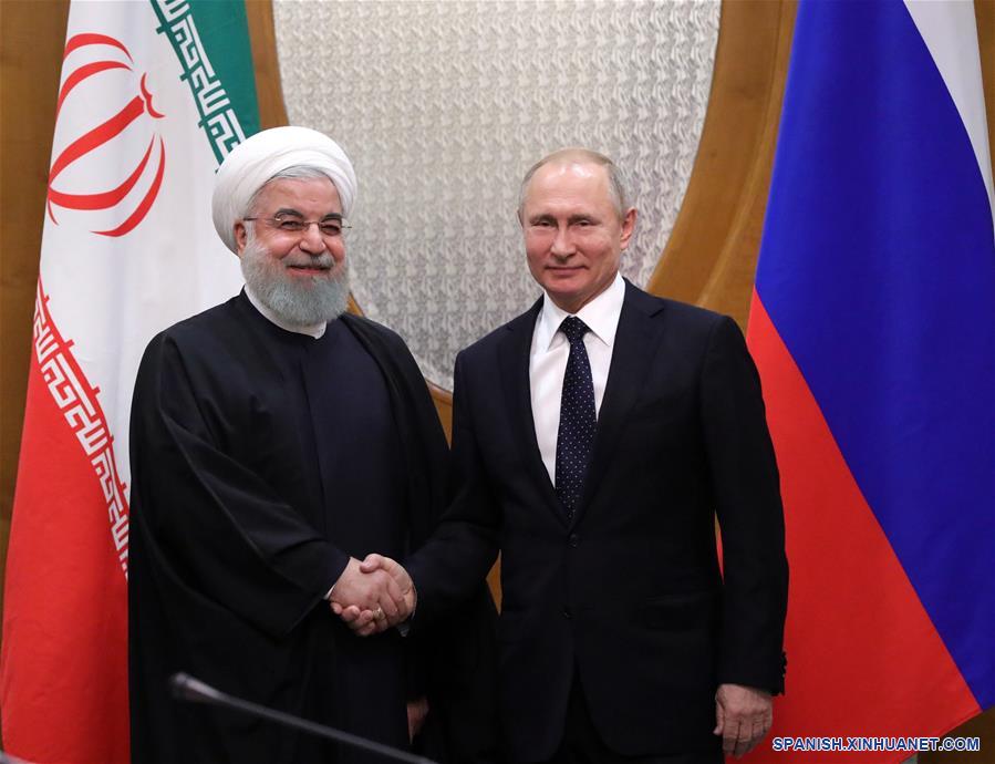 SOCHI, febrero 14, 2019 (Xinhua) -- El presidente de Rusia, Vladimir Putin (d), estrecha la mano con el presidente de Irán, Hassan Rouhani (i), durante una reunión en Sochi, Rusia, el 14 de febrero de 2019. (Xinhua/Sputnik)