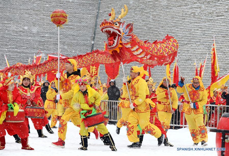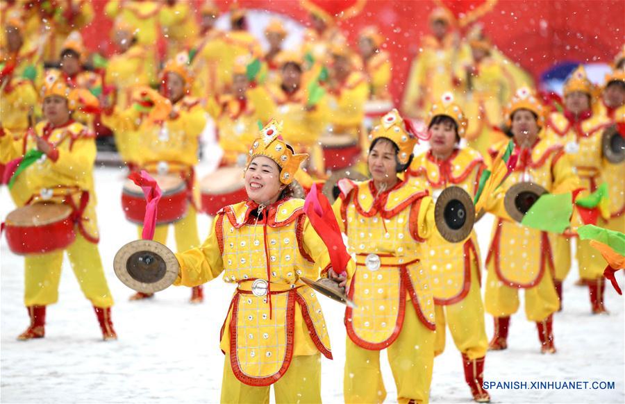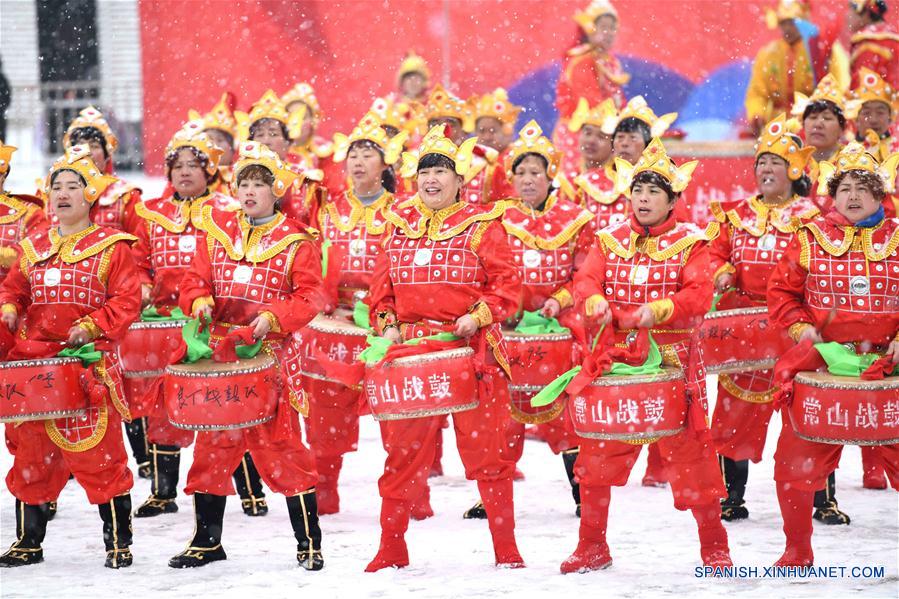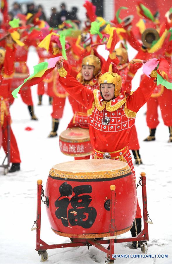 HEBEI, febrero 14, 2019 (Xinhua) -- Artistas realizan una actuación de tambor en la antigua localidad de Zhengding, en Shijiazhuang, provincia de Hebei, en el norte de China, el 14 de febrero de 2019. Un total de 12 equipos de percusión de la ciudad de Shijiazhuang realizaron actuaciones el jueves para celebrar el A?o Nuevo chino. (Xinhua/Liang Zidong)