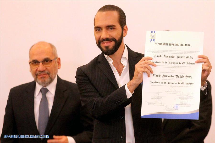 SAN SALVADOR, febrero 15, 2019 (Xinhua) -- El ganador de las elecciones presidenciales Nayib Bukele (d), recibe las credenciales que lo acreditan como presidente electo, en un hotel en San Salvador, El Salvador, el 15 de febrero de 2019. El ganador de las elecciones presidenciales del pasado 3 de febrero en El Salvador, Nayib Bukele, recibió el viernes del Tribunal Supremo Electoral (TSE) las credenciales que lo acreditan como presidente electo de El Salvador. (Xinhua/Alexander Pe?a)