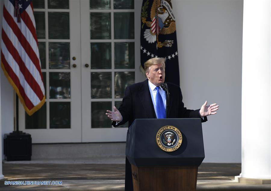 WASHINGTON D.C, febrero 15, 2019 (Xinhua) -- El presidente de Estados Unidos, Donald Trump, emite un anuncio en el Jardín de las Rosas de la Casa Blanca, en Washington D.C., Estados Unidos, el 15 de febrero de 2019. El presidente de Estados Unidos, Donald Trump, anunció el viernes que decretará una emergencia nacional para ampliar el muro fronterizo entre Estados Unidos y México e impulsar su emblemática promesa de campa?a. (Xinhua/Hu Yousong)