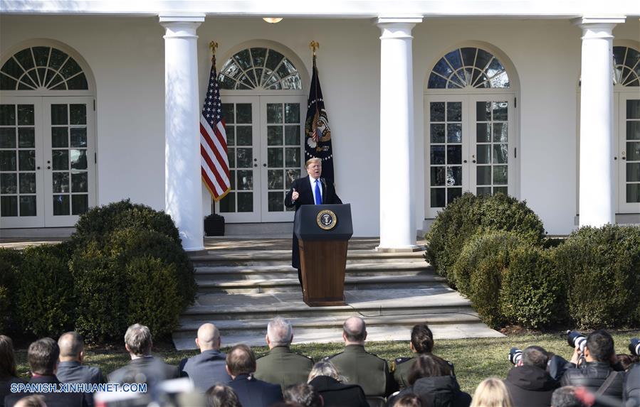 El presidente de Estados Unidos, Donald Trump (atrás), emite un anuncio en el Jardín de las Rosas de la Casa Blanca, en Washington D.C., Estados Unidos, el 15 de febrero de 2019. El presidente de Estados Unidos, Donald Trump, anunció el viernes que decretará una emergencia nacional para ampliar el muro fronterizo entre Estados Unidos y México e impulsar su emblemática promesa de campa?a. (Xinhua/Hu Yousong)