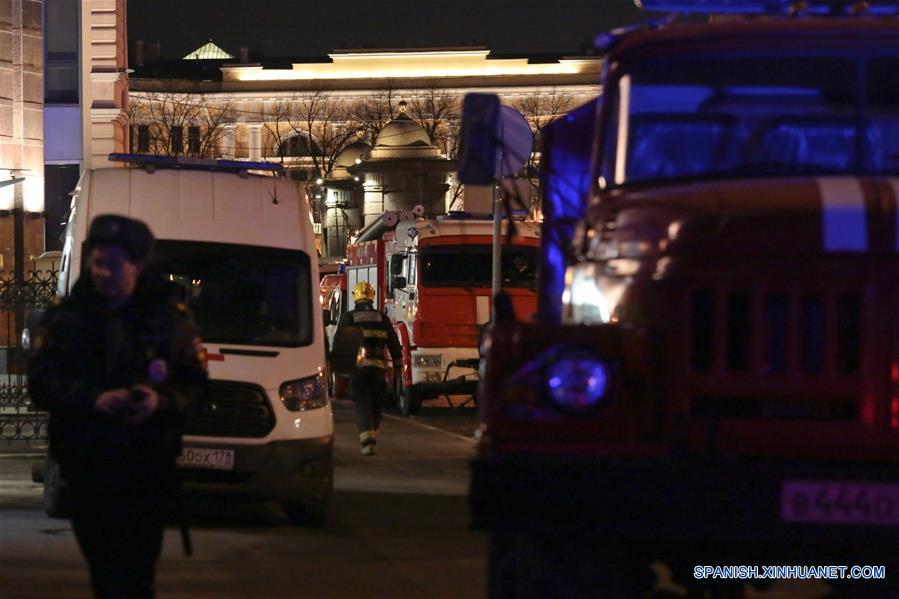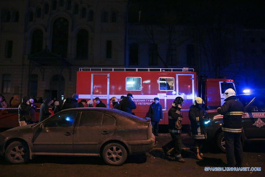 Rescatistas permanecen cerca del lugar donde se registró el colapso parcial de un edificio universitario, en San Petersburgo, Rusia, el 16 de febrero de 2019. No se reportaron víctimas atrapadas bajo los escombros de un edificio universitario que colapsó el sábado parcialmente en la ciudad rusa de San Petersburgo, informó el Ministerio de Emergencias de Rusia. (Xinhua/Irina Motina)