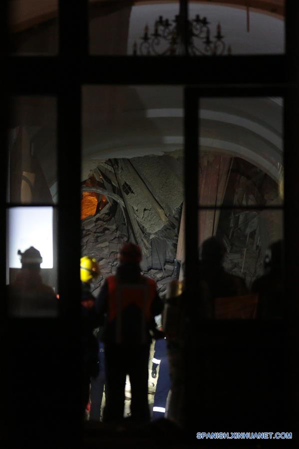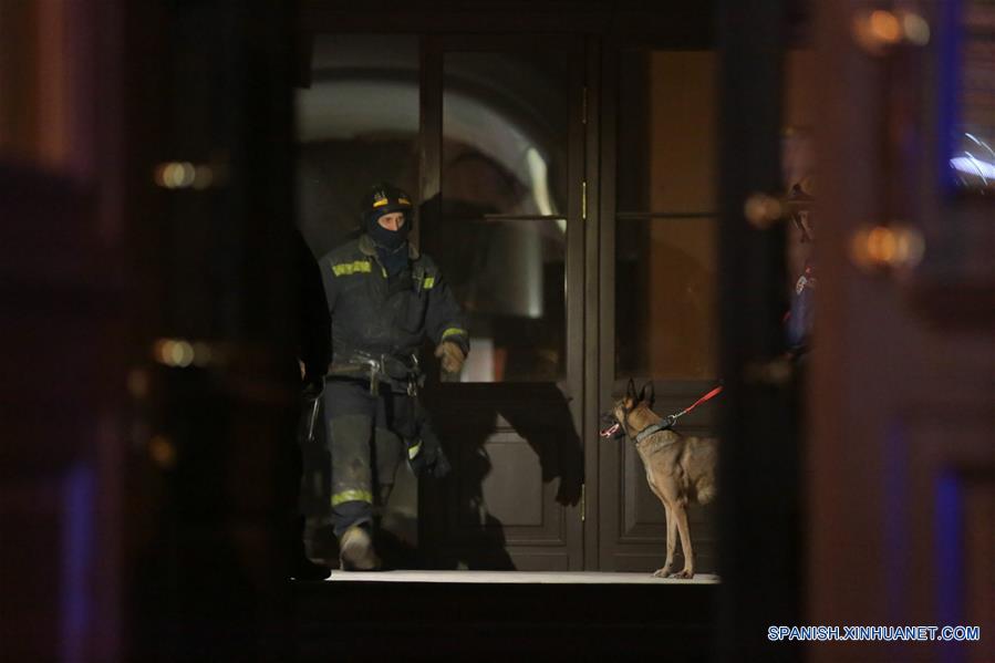 Rescatistas trabajan en el lugar donde se registró el colapso parcial de un edificio universitario, en San Petersburgo, Rusia, el 16 de febrero de 2019. No se reportaron víctimas atrapadas bajo los escombros de un edificio universitario que colapsó el sábado parcialmente en la ciudad rusa de San Petersburgo, informó el Ministerio de Emergencias de Rusia. (Xinhua/Irina Motina)