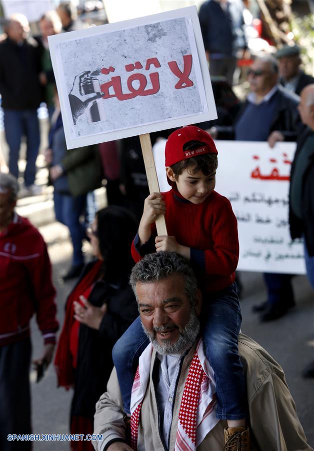 BEIRUT, febrero 17, 2019 (Xinhua) -- Un ni?o sostiene una pancarta durante una protesta en Beirut, capital de Líbano, el 17 de febrero de 2019. Cientos de libaneses protestaron el domingo en el centro de la capital de Beirut en contra del nuevo gobierno y sus políticas, informó la Agencia Nacional de Noticias. (Xinhua/Bilal Jawich)
