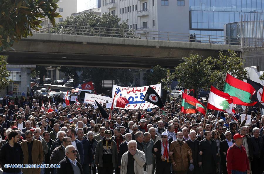 BEIRUT, febrero 17, 2019 (Xinhua) -- Manifestantes sostienen banderas y pancartas durante una protesta en Beirut, capital de Líbano, el 17 de febrero de 2019. Cientos de libaneses protestaron el domingo en el centro de la capital de Beirut en contra del nuevo gobierno y sus políticas, informó la Agencia Nacional de Noticias. (Xinhua/Bilal Jawich)