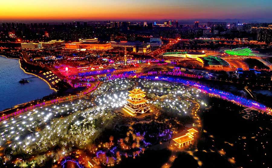 Vista aérea del parque Nanhu de Tangshan, provincia de Hebei del norte de China, 15 de febrero de 2019. El Festival de las Linternas se celebra el 19 de febrero este a?o. [Foto / Xinhua]