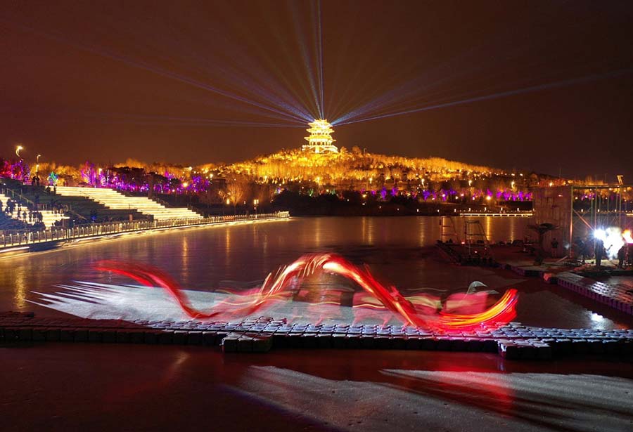Vista aérea de una representación artística tradicional del baile del dragón en el parque Nanhu de Tangshan, provincia de Hebei del norte de China, 15 de febrero de 2019. El Festival de las Linternas se celebra el 19 de febrero este a?o. [Foto / Xinhua]
