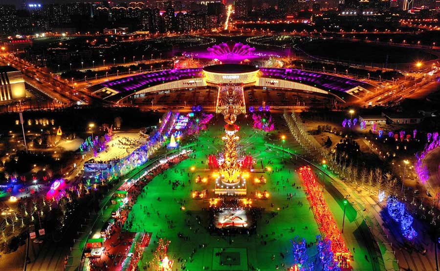 Vista aérea del parque Nanhu de Tangshan, provincia de Hebei del norte de China, 15 de febrero de 2019. El Festival de las Linternas se celebra el 19 de febrero este a?o. [Foto / Xinhua]