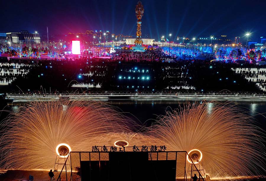 Vista aérea de una representación artística tradicional del fundido de metal en el parque Nanhu de Tangshan, provincia de Hebei del norte de China, 15 de febrero de 2019. El Festival de las Linternas se celebra el 19 de febrero este a?o. [Foto / Xinhua]